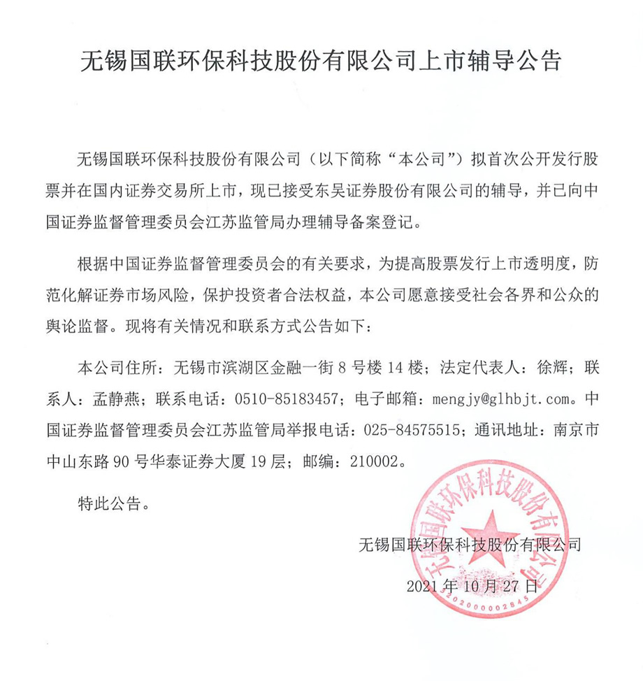 無錫國聯環保科技股份有限公司成立于2011年1月27日,是一家以污泥減量化、無害化、資源化處置為產業化發展的國有控股企業,股本為109,470,852元。